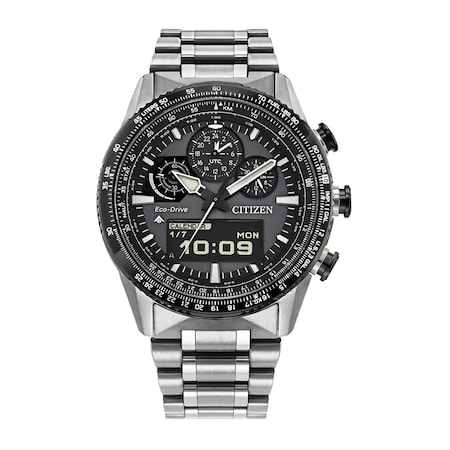 Reach a higher altitude in style and performance with the new Promaster Skyhawk. This action-ready chronograph features a silver-tone stainless steel case and a captivating grey analogue-digital dial, with its bold 43mm case secured to the wrist via a sharply finished triple-link bracelet. A rotating slide-rule bezel alongside a modern set of pushers and a matching crown round out the sporty styling of the case. Underneath a scratch-resistant sapphire crystal, the watch's azure display is on view, with white and black accents working in tandem with analogue and digital components for the watch's unique aesthetic and technical capabilities. The advanced functions of the timepiece include analogue-digital timekeeping, a perpetual calendar, an alarm, 1/100 second chronograph measuring up to 24 hours and a 99-minute countdown timer. Water resistant up to 200 metres.