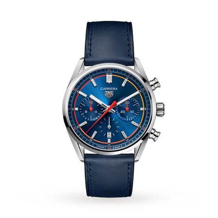 Complete with vibrant and vivid orange detailing against the signature blue, this chronograph is like no other.