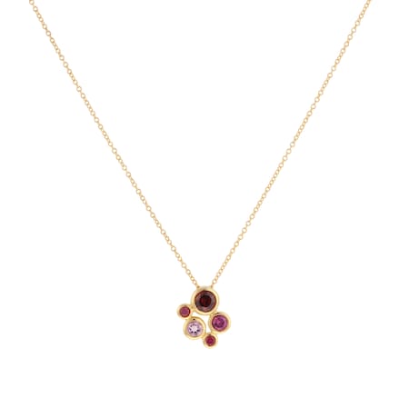 Set in glowing 18ct yellow gold, with ruby, garnet and pink tourmaline as the centrepiece, the stones are encompassed in a harmonious bezel setting.