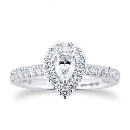 Set on a delicate platinum band, a mesmerising pear-cut central diamond is embraced by a halo of equally radiant diamonds totalling 0.60 carats.