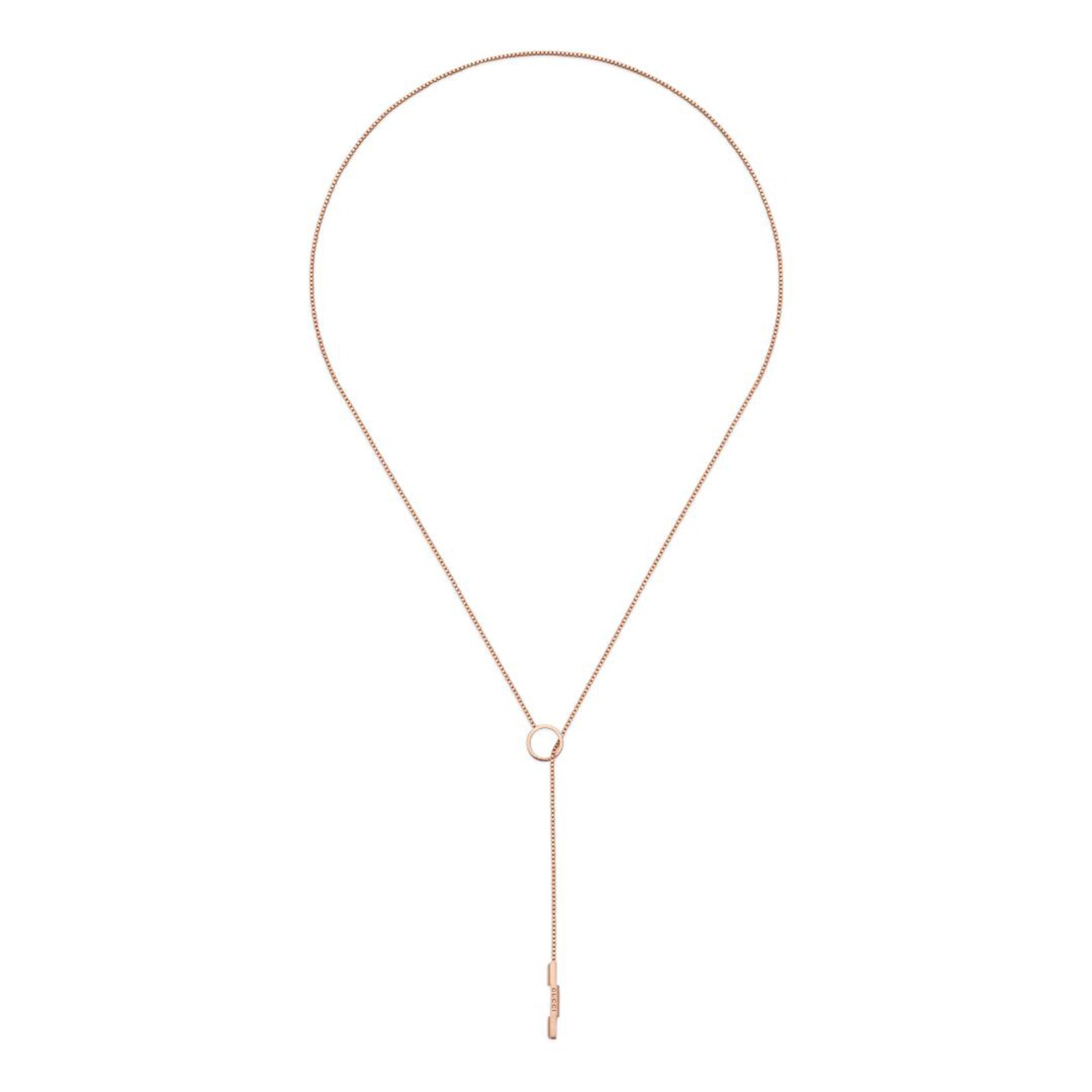 The Gucci Link to Love collection is an exploration of modern romance characterizing new symbols of love. The collection combines different gold tones and a mix of finishes blending the lines between masculine and feminine. Each piece is meant to inspire individualized ways to wear them with stackable and layered features. This 18ct rose gold lariat necklace has a 'Gucci' engraving on the bar pendant.