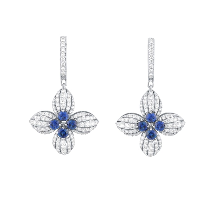 Crafted in luxurious 18ct white gold, these Love in Verona flower earrings showcase expertly set diamonds and vibrant rubies that capture light with every movement. The delicate floral design combines timeless elegance with a refined sparkle, making them an exquisite choice for those seeking sophistication and enduring beauty in fine jewellery.