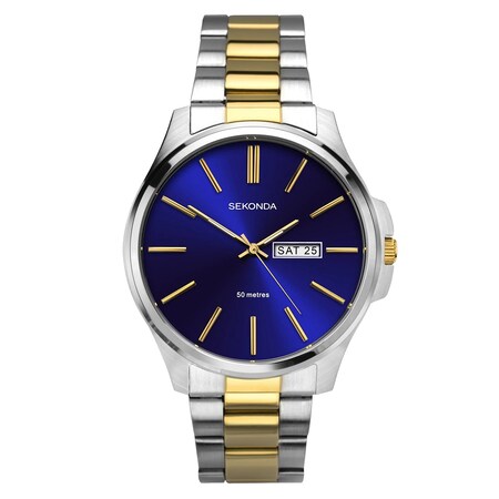 This timepiece has a round stainless steel case housing a vibrant blue sunray dial with gold coloured batons and a day/date display. The watch is fastened with a two-tone stainless steel bracelet and has water resistance to 50m. A statement timepiece ideal for every day wear.