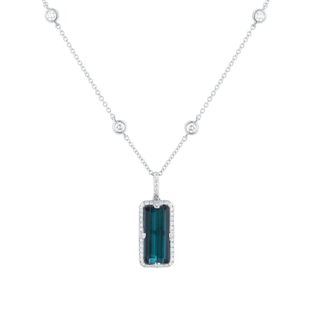 This pendant showcases 5.06ct of round brilliant cut green tourmalines, their tranquil hue complemented by 0.30ct of diamonds. The diamonds, graded VS for clarity and G for colour, are delicately set to enhance the tourmaline’s natural radiance.