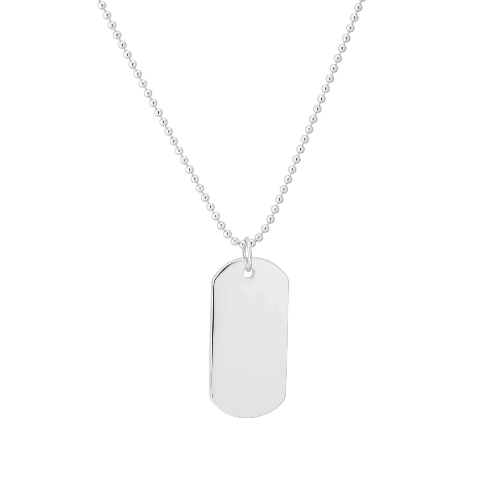 This sterling silver necklace features a double dog tag design suspended from a beaded chain, creating a look that is both distinctive and refined. Its polished finish and thoughtful proportions make it an ideal choice for those who value understated sophistication