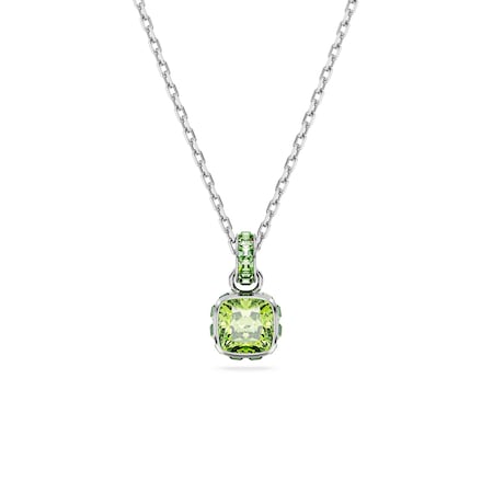 This delicate pendant is inspired by the birthstone of August. Hanging from a fine chain with a shimmering link of crystals, the rhodium plated jewellery features a single square-cut stone in a peridot green hue, representing a fresh perspective and empowerment every day. This meaningful design makes a magical birthday gift or can be worn to celebrate a time that is significant to you.