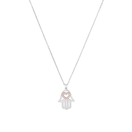 The hand of Fatima, which symbolically protects against bad experiences and evil events, is one of the most famous oriental symbols. Sparkling zirconia (synthetic) stones on a heart adorn the pendant, which has been crafted with attention to detail.